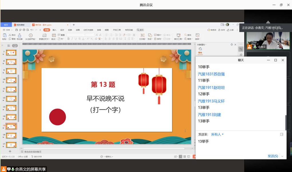 国庆遇上中秋,两个特别的日子交织在一起,更是增添了更多意义。为弘扬传统文化,提高我院学生的文化素养,学院借助中秋节的契机,在腾讯会议上发起线上猜灯谜活动,由主持人发起谜面,选手通过线上举手抢答,第一个说出正确答案的选手胜出。线上猜灯谜活动将天南地北的交通人连接在一起感受节日的氛围,体验传统文化的魅力。